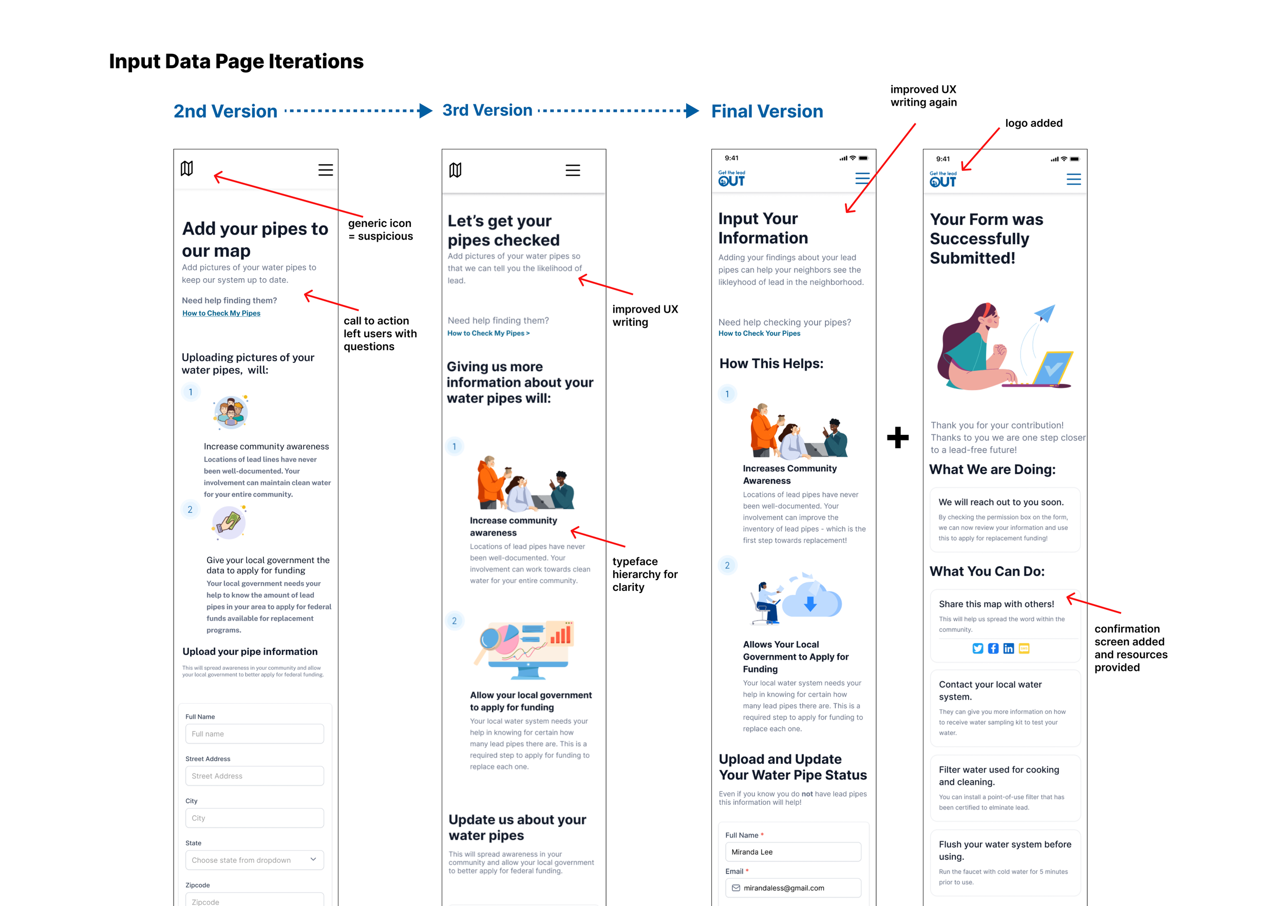 Implementation: Onboarding flow helps guide users through info on why it is important to identify lead pipes and resources such as links to water department contacts and water testing kits